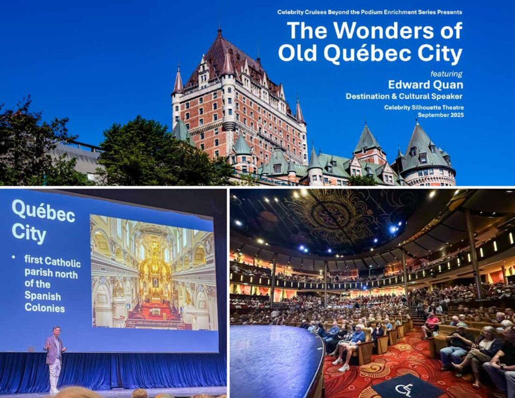 In September 2025, Edward served aboard the Celebrity Silhouette. His keynote presentation, titled “The Wonders of Old Quebec City,” captivated the passengers, attracting a crowd so large that it overflowed the main theatre, which seats 1,250 guests. The popularity of his talk was evident, with some passengers sitting on the aisle steps and others standing at the back to listen and participate, demonstrating the impact and appeal of his storytelling and expertise.